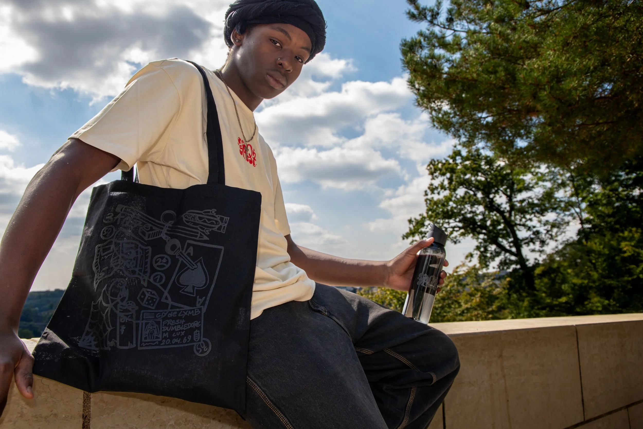 Shop › Tot(e)ally chaos Image 1 of 5 Image 2 of 5 Image 3 of 5 Image 4 of 5 Image 5 of 5 Tot(e)ally chaos €15.00 Tote Bag with Puff ink in black or regular ink in whiteMade of 100% Organic CottonHandprinted with LOVEDesigned by Anouk Farbe: Black (puff ink) White (regular ink) Purchase Added! Tote Bag with Puff ink in black or regular ink in whiteMade of 100% Organic CottonHandprinted with LOVEDesigned by Anouk You Might Also Like Nature's Stare €15.00 Ausverkauft Bubble Splash Tote Bag €15.00 Tote Bag €18.00 Ausverkauft